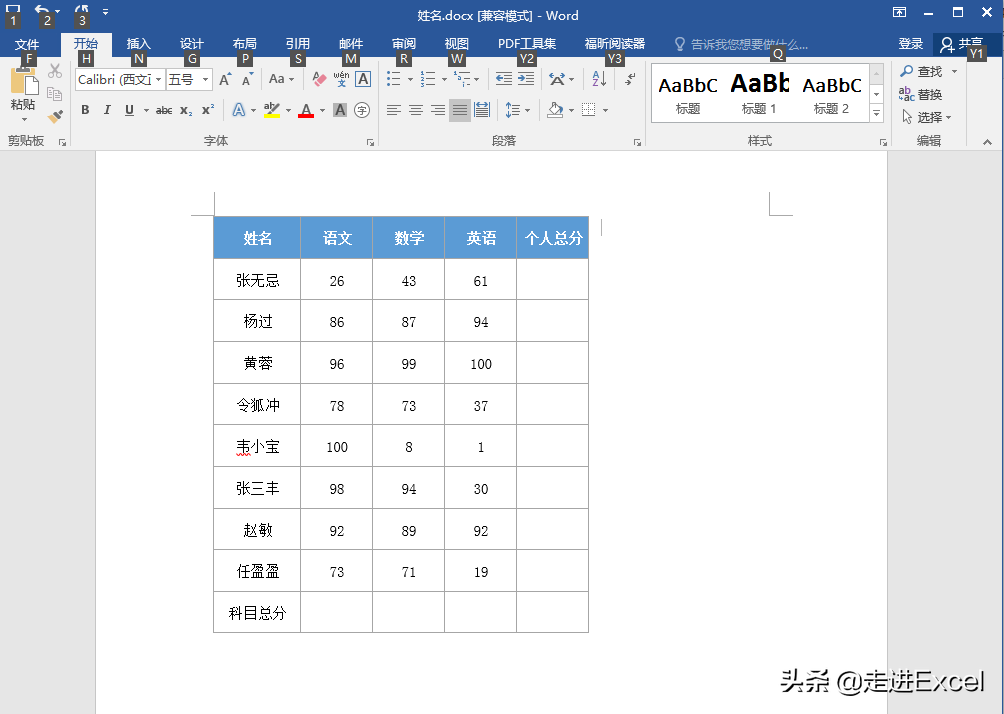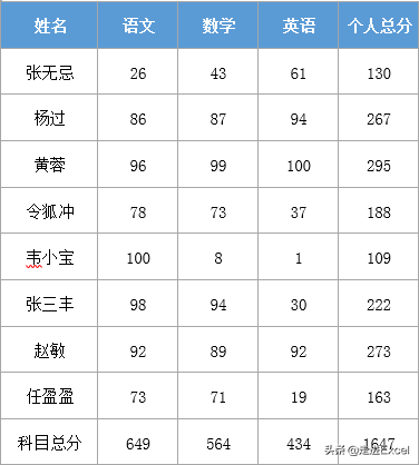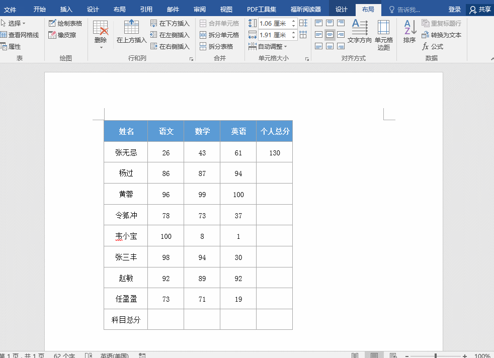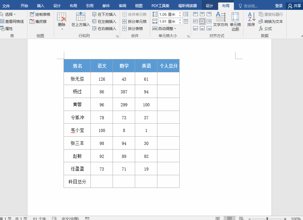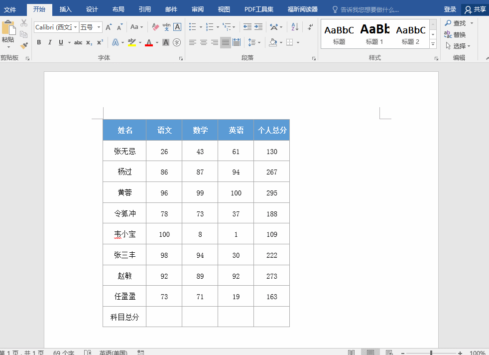 如上图,这是一张Word中的各科成绩表。按照正常思维,一般人肯定是直接复制到Excel中用sum函数求和,简单粗暴。可是如果对于后期要经常修改的数据,每一次修改都要复制到Excel中求和,在粘贴到Word,非常繁琐。如果直接在Word中求和,每一次修改数据后结果会自动更新,方便快捷。