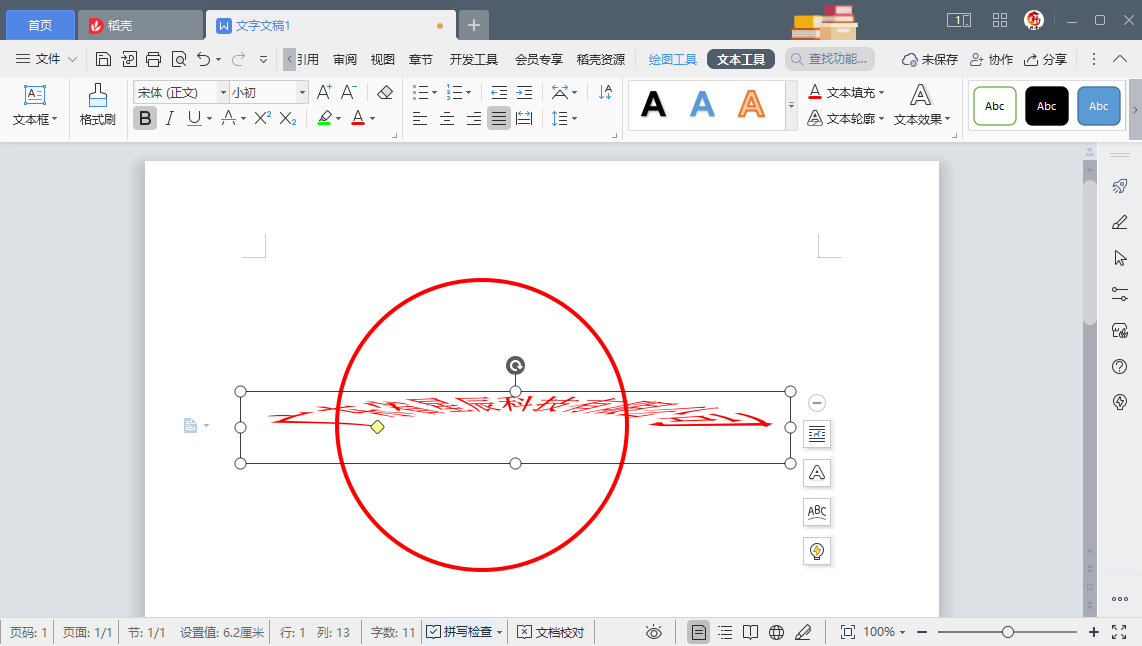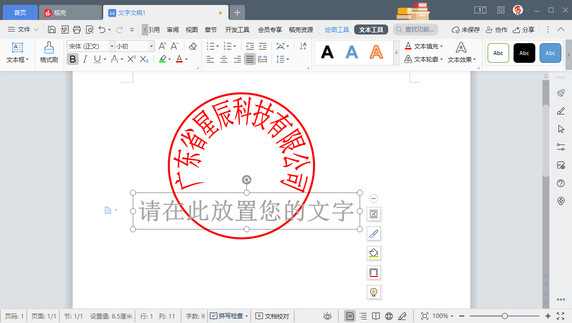 单击【艺术字】输入框,输入印章名称,选中印章名称,单击【文本工具】菜单,单击【文本填充】选择【红色】。