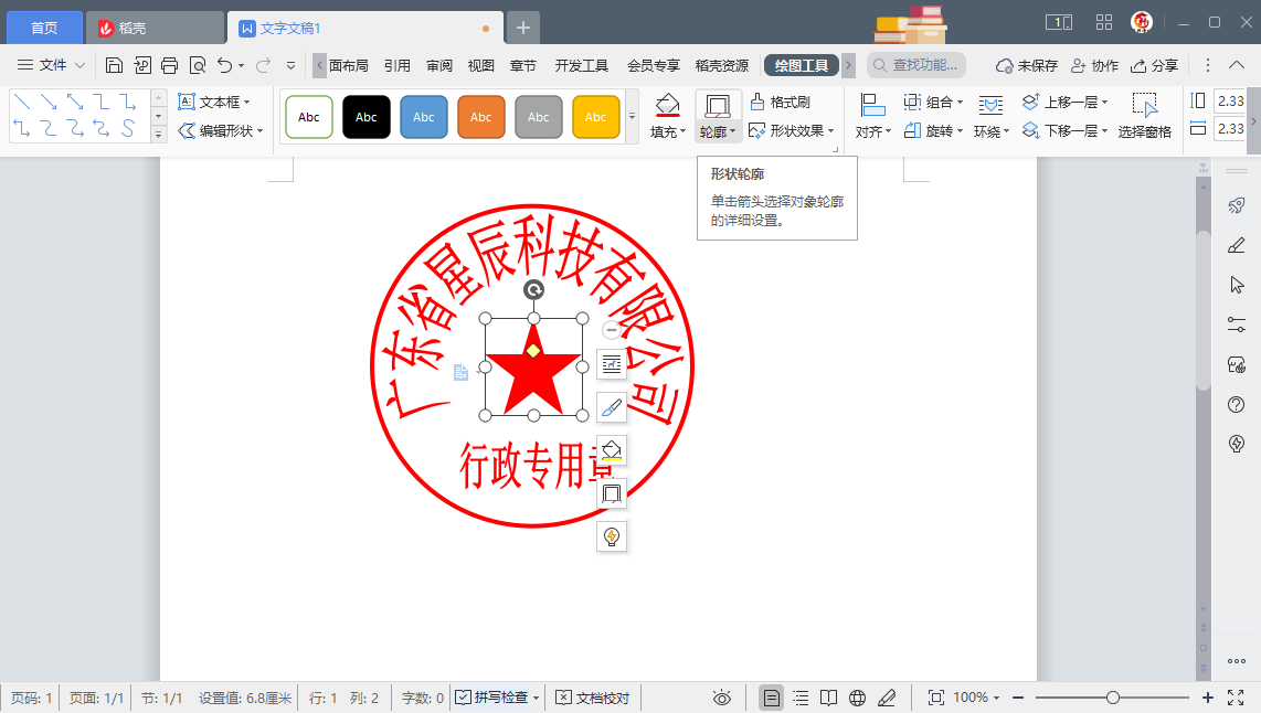 最后,调整各个形状的位置后,选中所有形状,在【快捷对齐工具】菜单中单击【组合】,这时,公司的电子印章就做好了。
