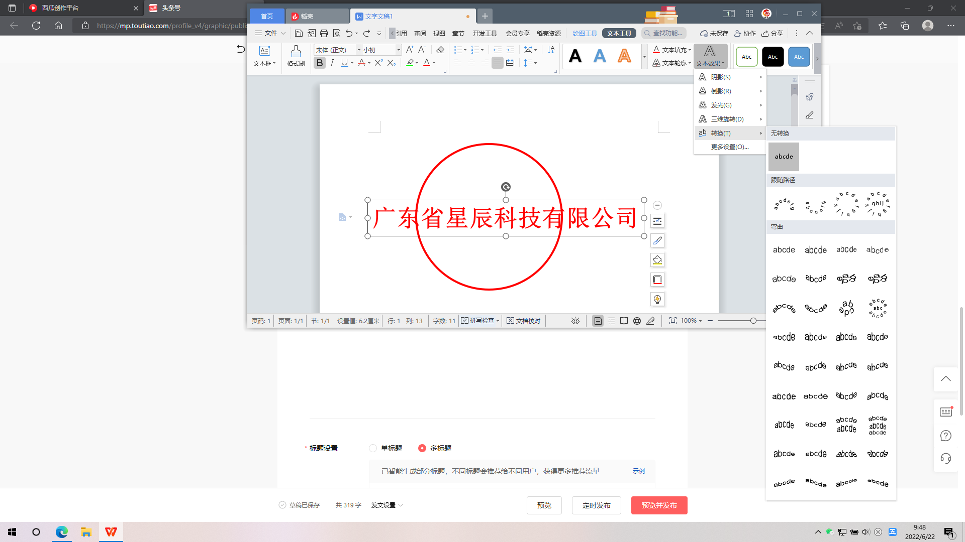 利用鼠标左键拖动【艺术字】中的黄色菱形锚点,调整公司名称弯曲的角度。