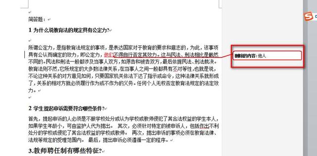 我们的文档处于修订状态之后,我们就来尝试对文档进行修改,比如我们对文档中的“他人”进行删除替换为“他们”,我们会发现在文档的右侧会有一个批注框,该批注框显示的就是修订的信息,显示了,修订的内容,比如这里显示的是“删除的内容:他人”,这样我们在后面的校正当中就很轻松了,大大提高了我们的工作效率。
