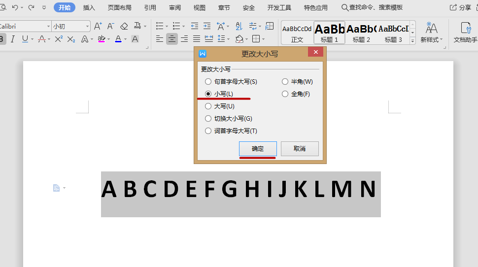 选中英文字母,点击开始→点击文字后面的倒三角符号→选择更改大小写(C)→点击小写(L),点击确定就OK了。