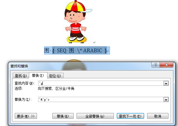 复制这个域代码以及它前面的标签,按住Ctrl+H调出【查找和替换】对话框,在“查找内容”处输入“^g”,在“替换处”输入“^&^p^c”,点击“全部替换”。如图所示: