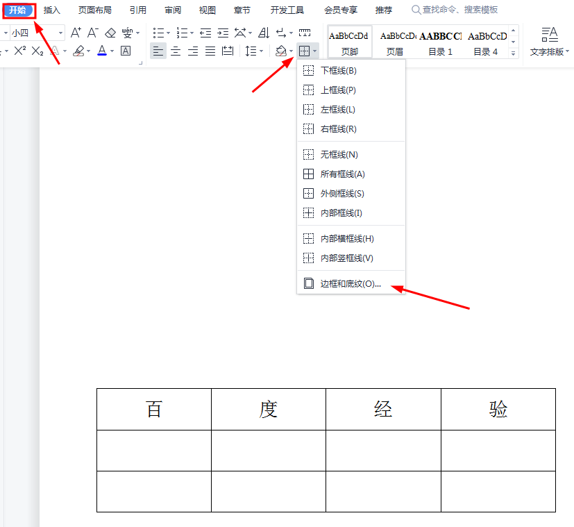 选中目标表格→菜单栏点开始→边框→边框和底纹