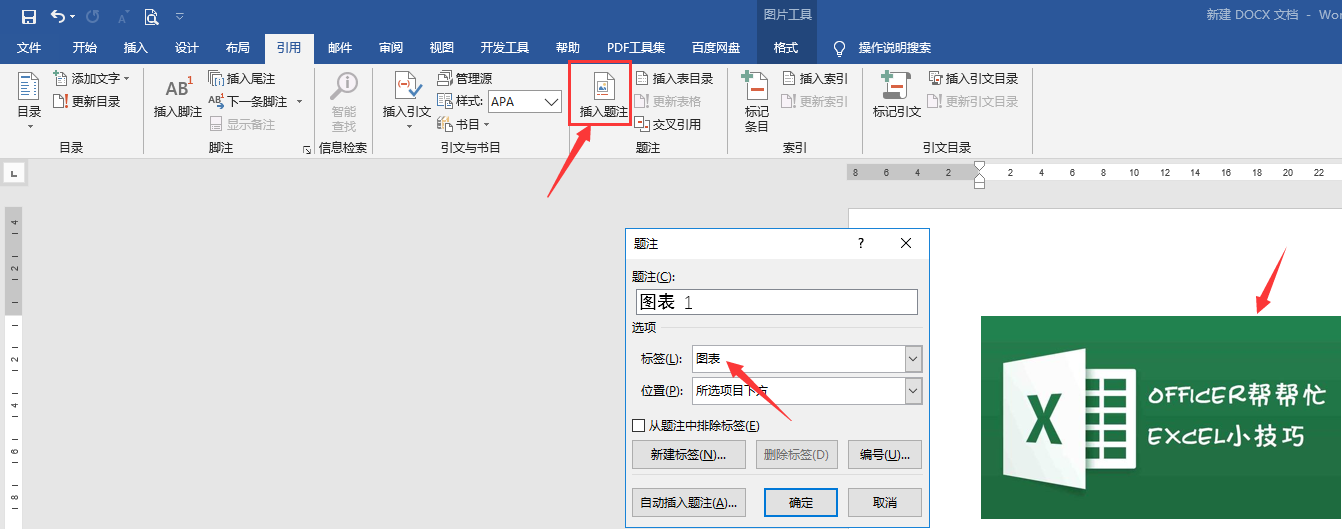 メ如何批量添加呢?我们先选中第一张图片,点击【引用】-【插入题注】选择标题为【图表】后确定。メ
