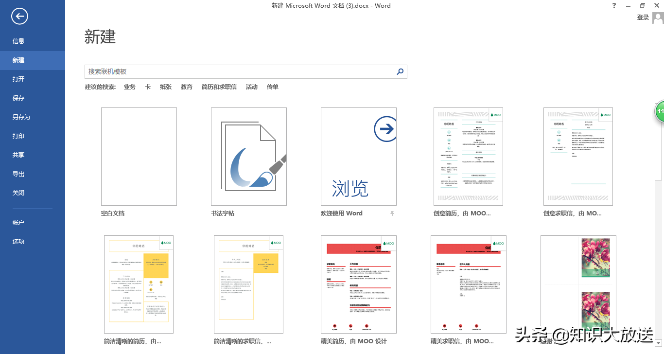 1. 在 Word 中打开【文件】选项卡的【新建】命令,你会看到各种各样的模板如下图: