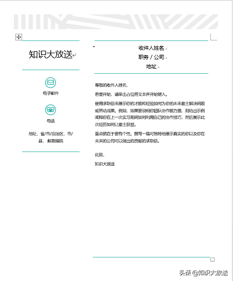 3. 然后,就会打开一个新的 Word文档,那么只需要将你们的个人信息填写到相应的区域就可以了,一份牛X的求职信就新鲜出炉了。
