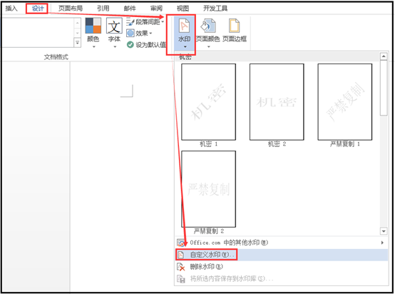 1、点击菜单的【设计】—【水印】—【自定义水印】;