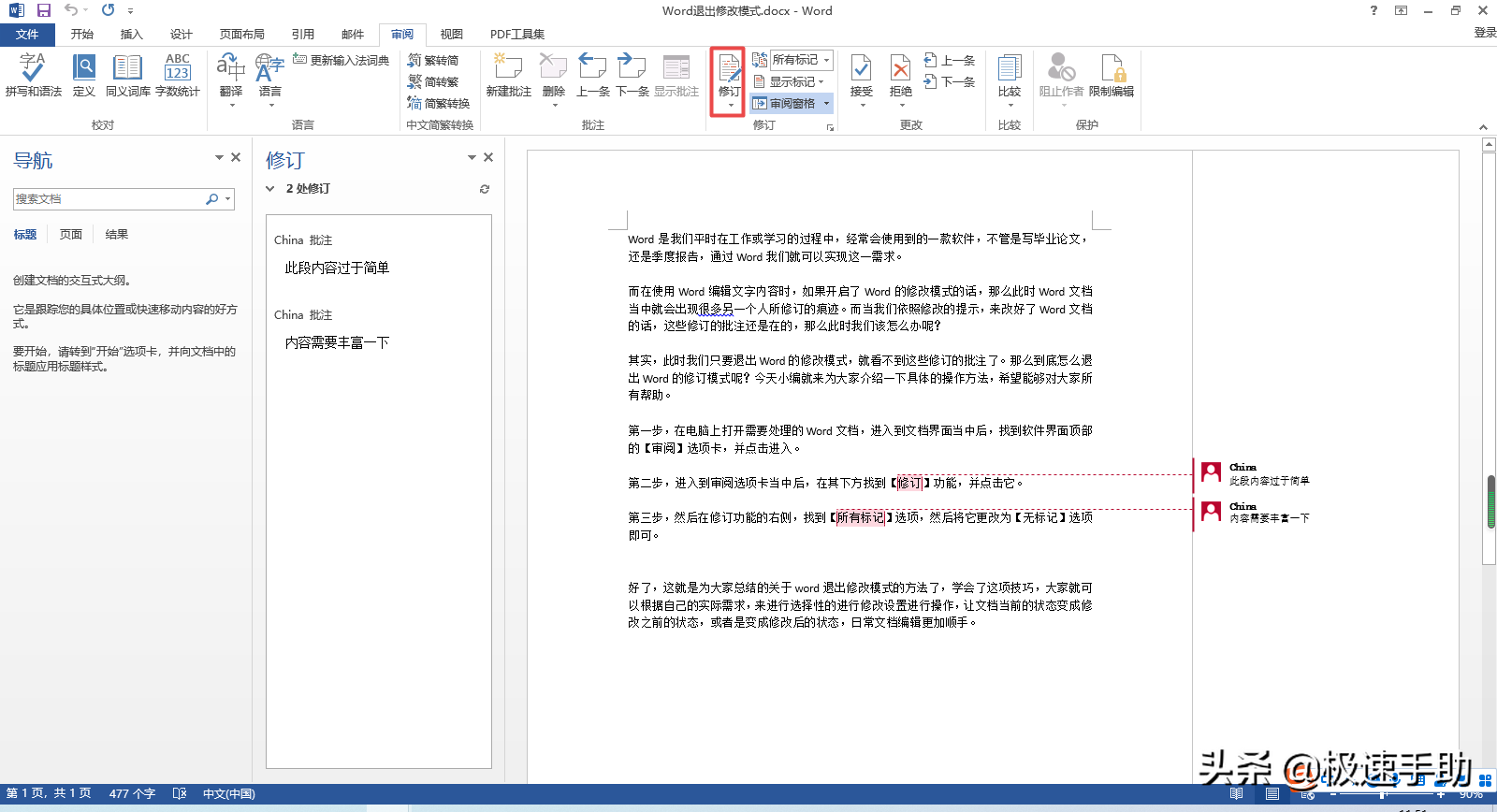 第六步,最后回到word文档界面后,在审阅窗格的修订中也没有了批注的标记,文档界面变得很干净了。