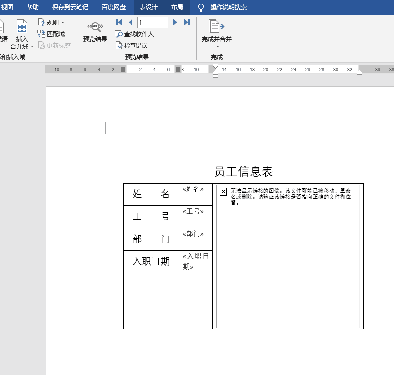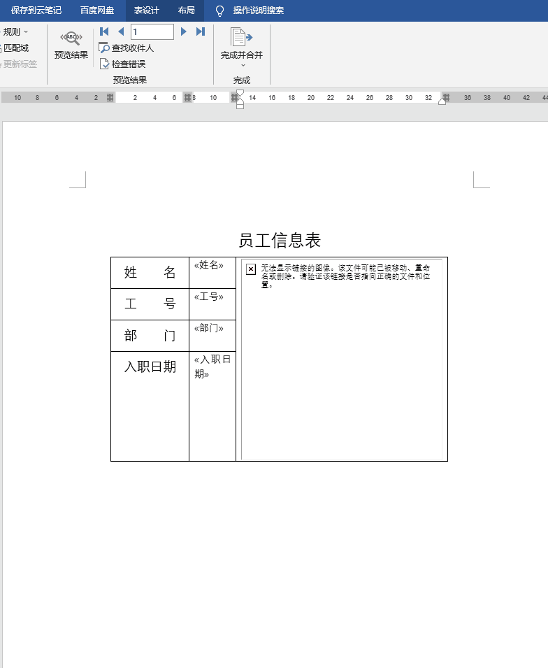 此时,我们会发现已经生成出了邮件合并的文档,所有信息都正确,就是照片或图片无法显示出来。