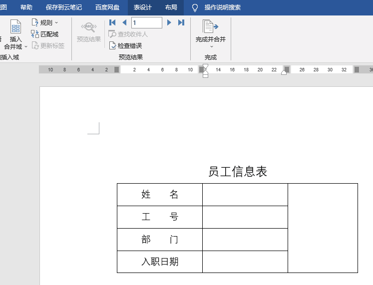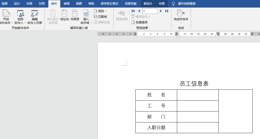 将光标定位到空白单元格,进入「邮件」——「编写和插入域」——「插入合并域」,对应单元格依次插入。