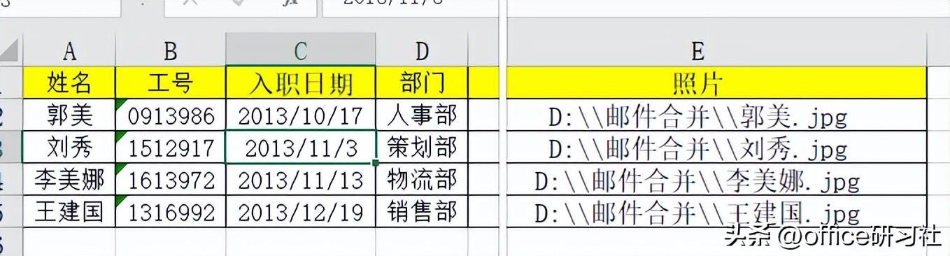 这里,我以带照片的员工信息表为例,员工信息表模板都一样,只是其中的姓名、照片、工号等信息有所变化。