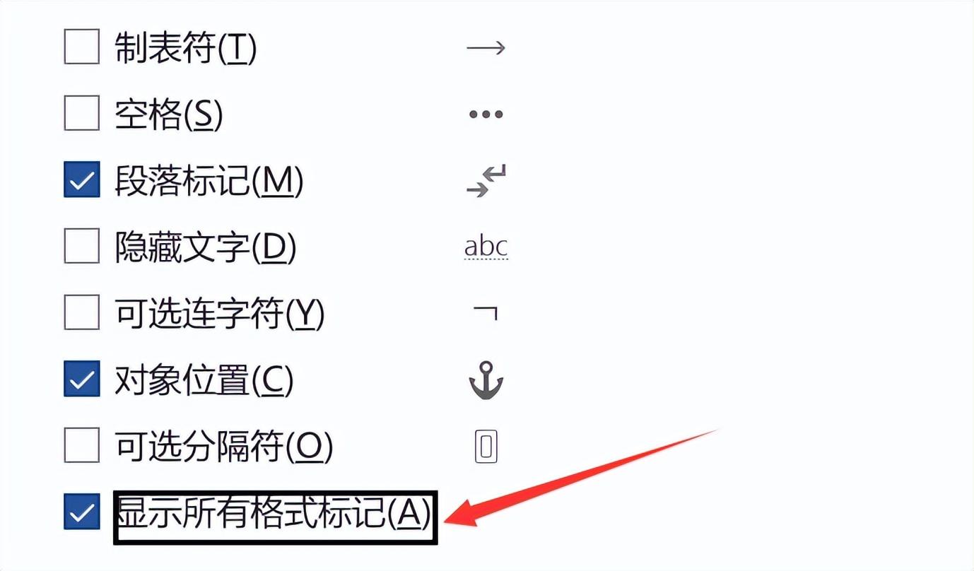 第四步:最后在显示菜单中勾选右边的【显示所有格式标记】