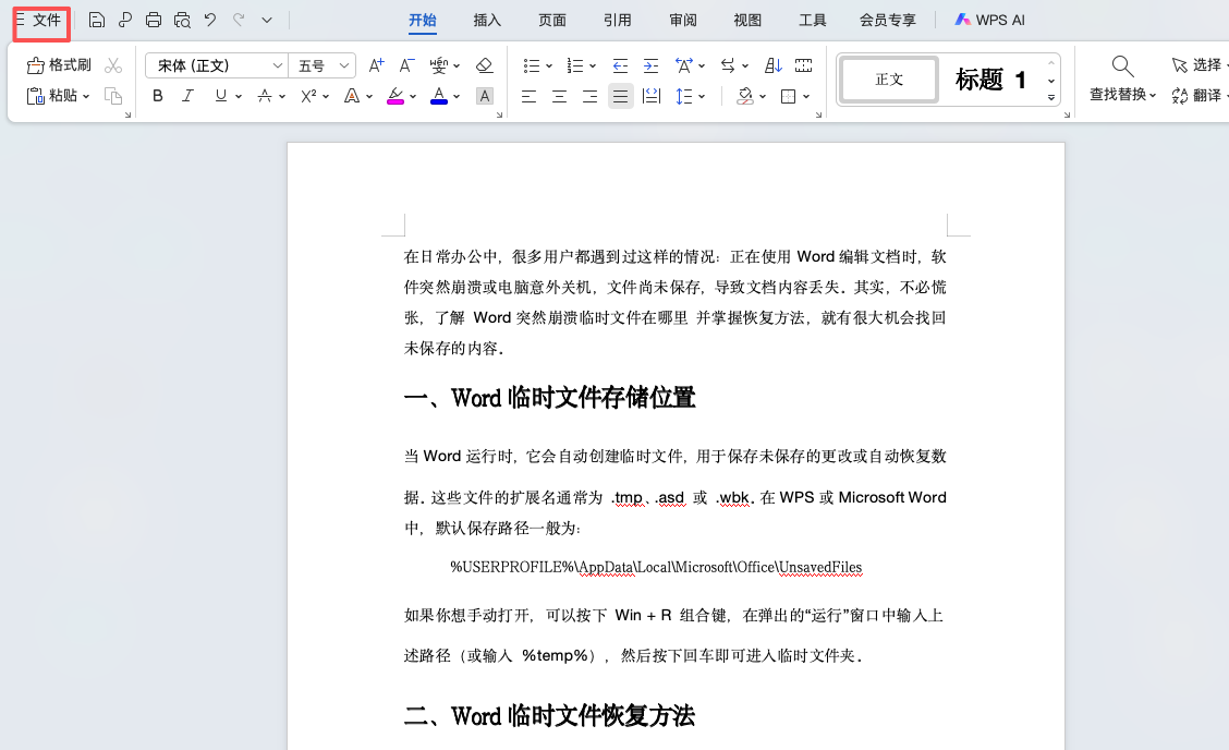 当Word运行时,它会自动创建临时文件,用于保存未保存的更改或自动恢复数据。这些文件的扩展名通常为 .tmp、.asd 或 .wbk。在WPS或Microsoft Word中,默认保存路径一般为: