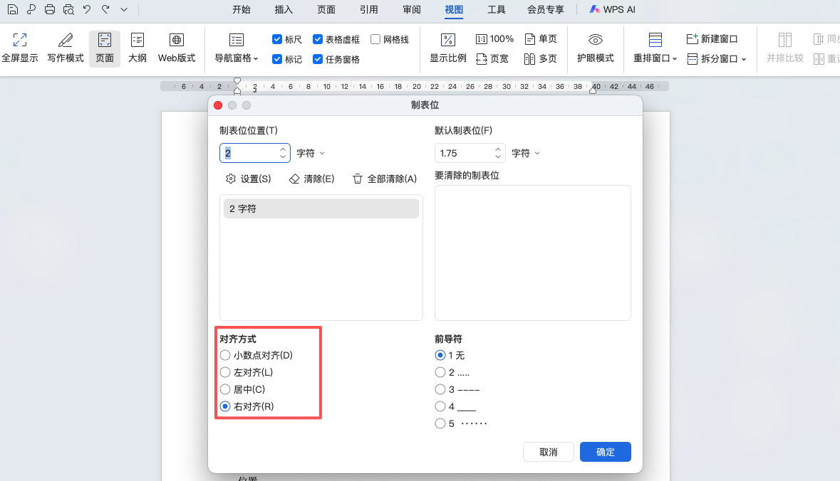 3、打开设置,会出现不同类型的制表符(左对齐、右对齐、居中、小数点对齐等),可根据需求选择。