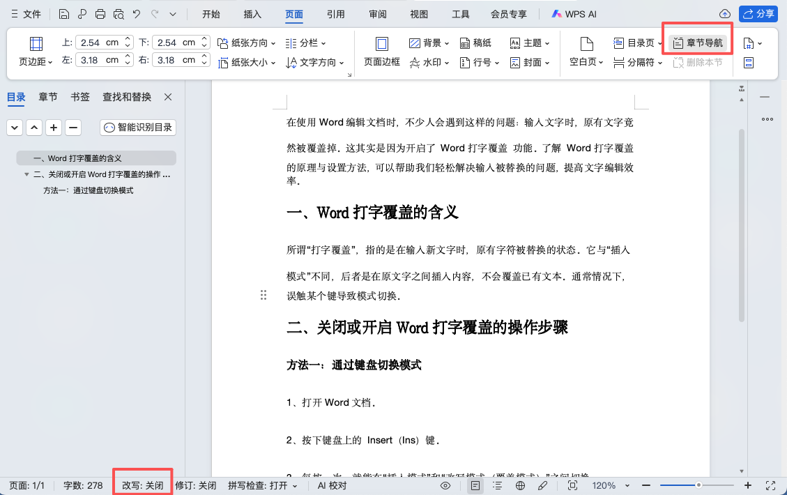 2、高效编辑文档:在修改短篇文字或替换数据时,适当开启“打字覆盖”,比“删除+输入”更快捷。