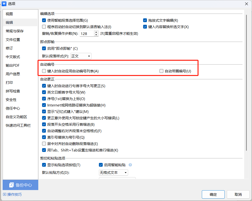 - 菜单栏设置:点击“文件”→“选项”,弹出窗口后选择“编辑”,取消勾选“键入时自动应用自动编号列表”,点击确定即可关闭该功能。