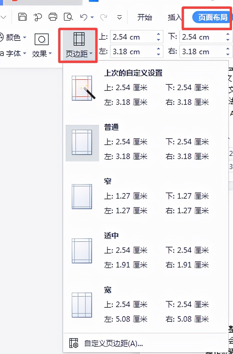 操作步骤:在【页面布局】选项卡的功能区选择【页边距】,在弹出的选项中选择需要的页边距。