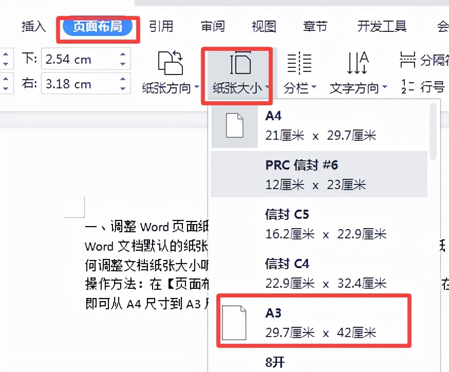 操作方法:在【页面布局】选项卡的功能区选择【纸张大小】,在弹出的选项中选择【A3】,即可从A4尺寸到A3尺寸的修改。