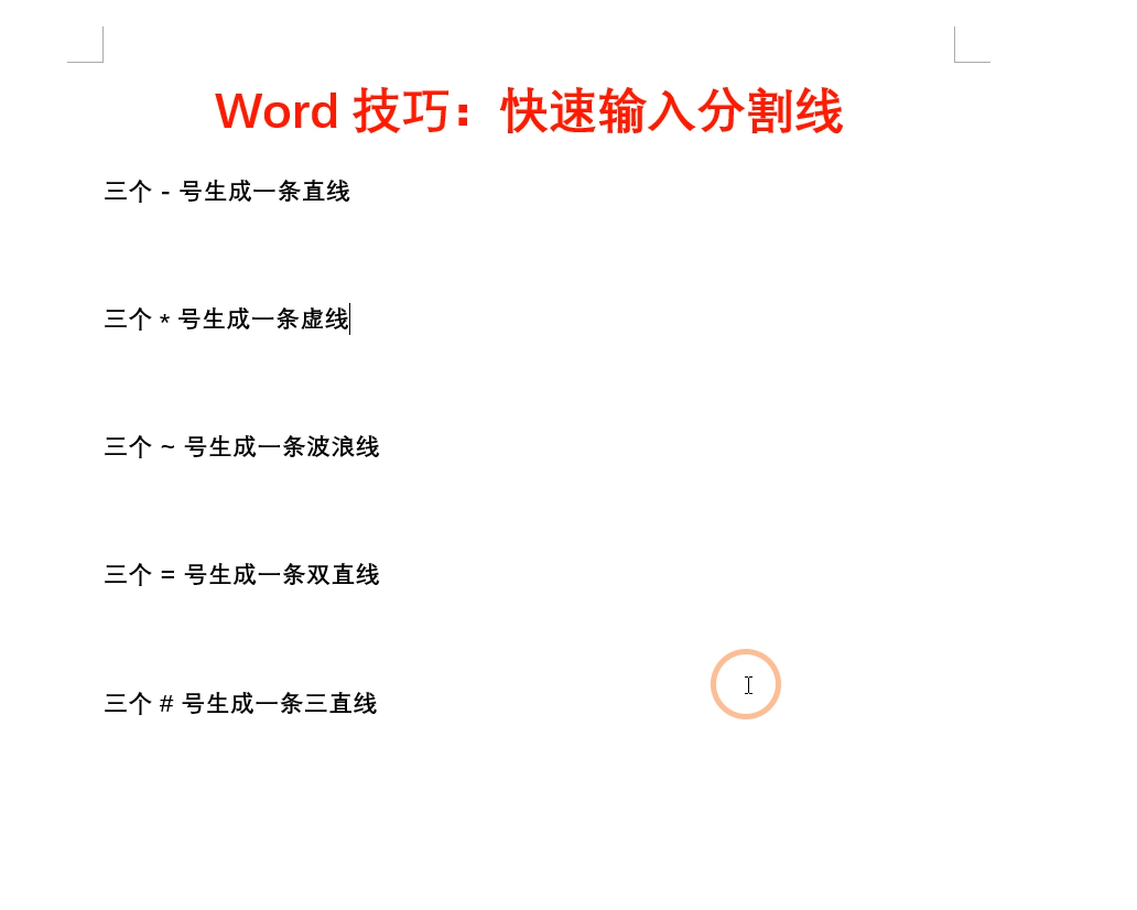 很多人在Word文档中录入分割线,都是一个符号一个符号的录入,直到填充整行,今天跟大家分享一种快速录入分割线的小技巧,只需要输入三次符号,然后按下回车键就能自动生成分割线,效果如下图所示。