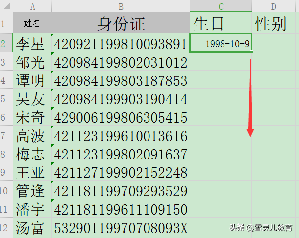 4.确定之后会返回表格。我们可以看到生日信息已经自动填进去了。,我们只需要向下填充,就可以得到全部的生日信息了。