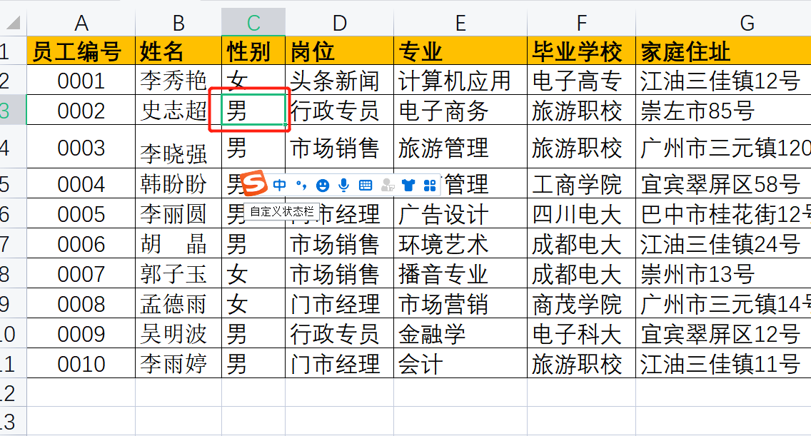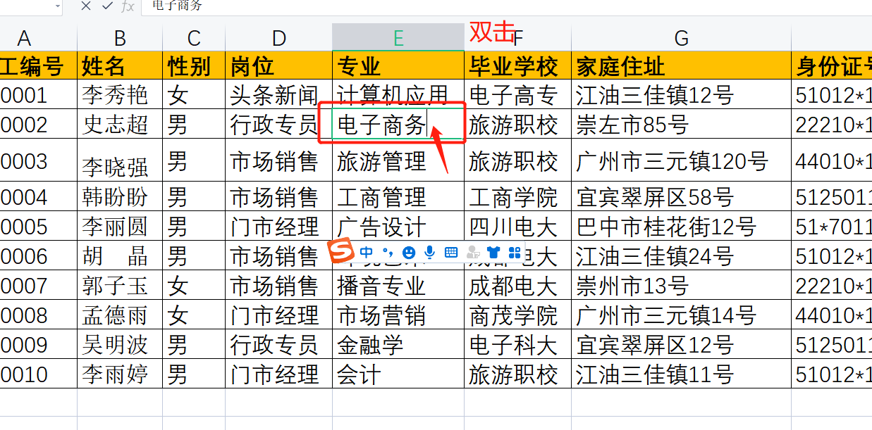部分修改:进入编辑状态(有编辑框,光标闪动)(双击、按F2键、