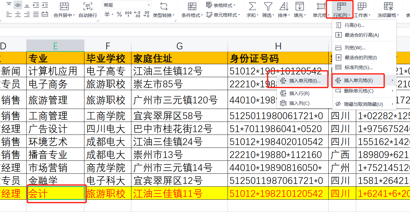 选定单元格(单元格区域),开始—行和列—插入单元格或删除单元格