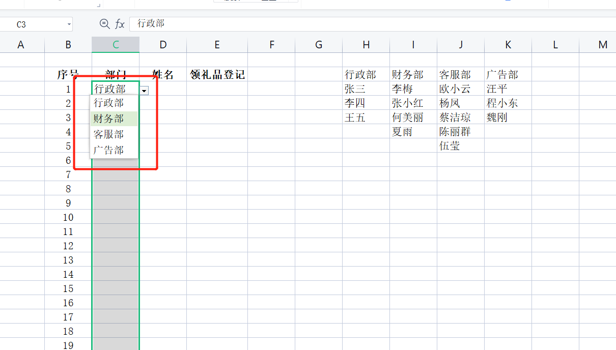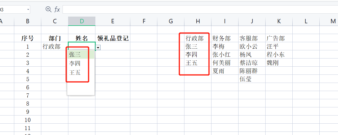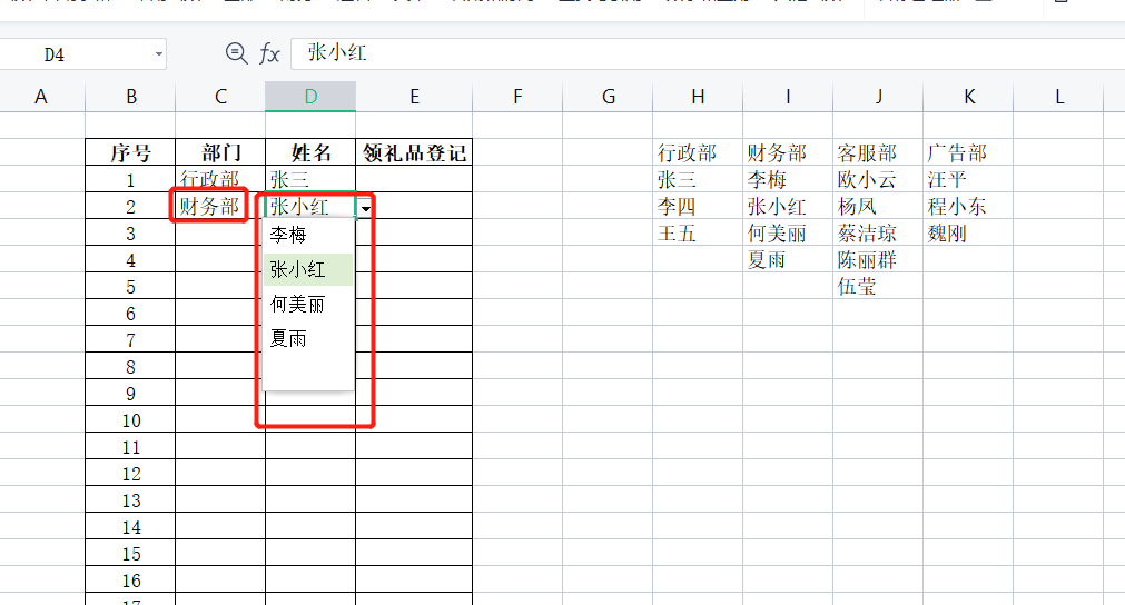 例如下面的这张表,我们在部门里选择之后,对应的姓名就是这个部门的人,而不是其他部门的人。这个就是级联下拉式菜单。