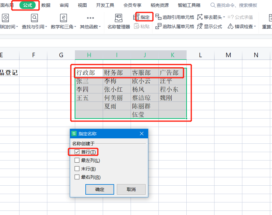 选中右边数据列——点击公式——点击指定——选中首行——点击确定