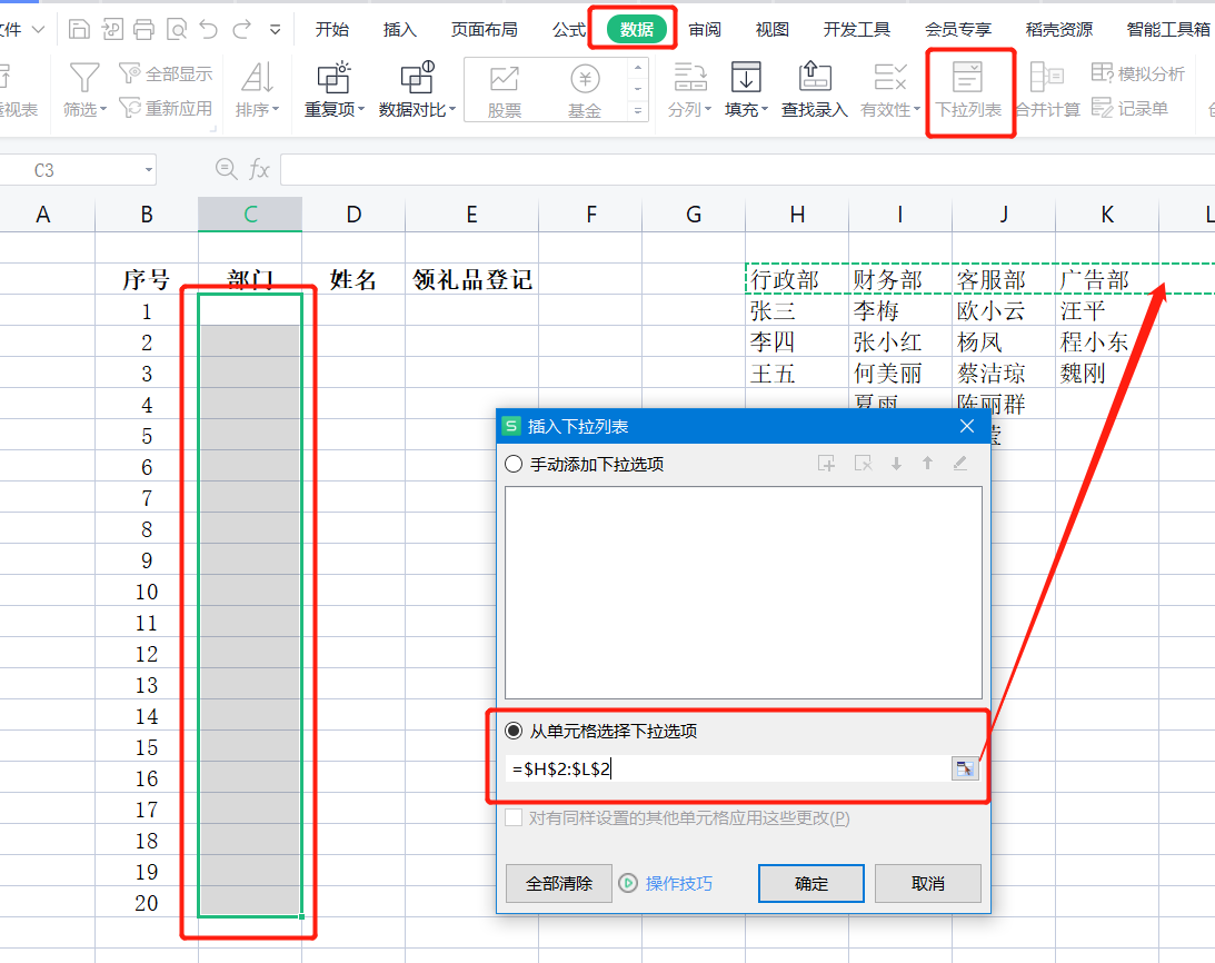 选中C3到C22列——点击数据——点击下拉列表——选中从单元格选择下拉选项——选择H2到K2数据(这里边绝对引用,多选也没事)