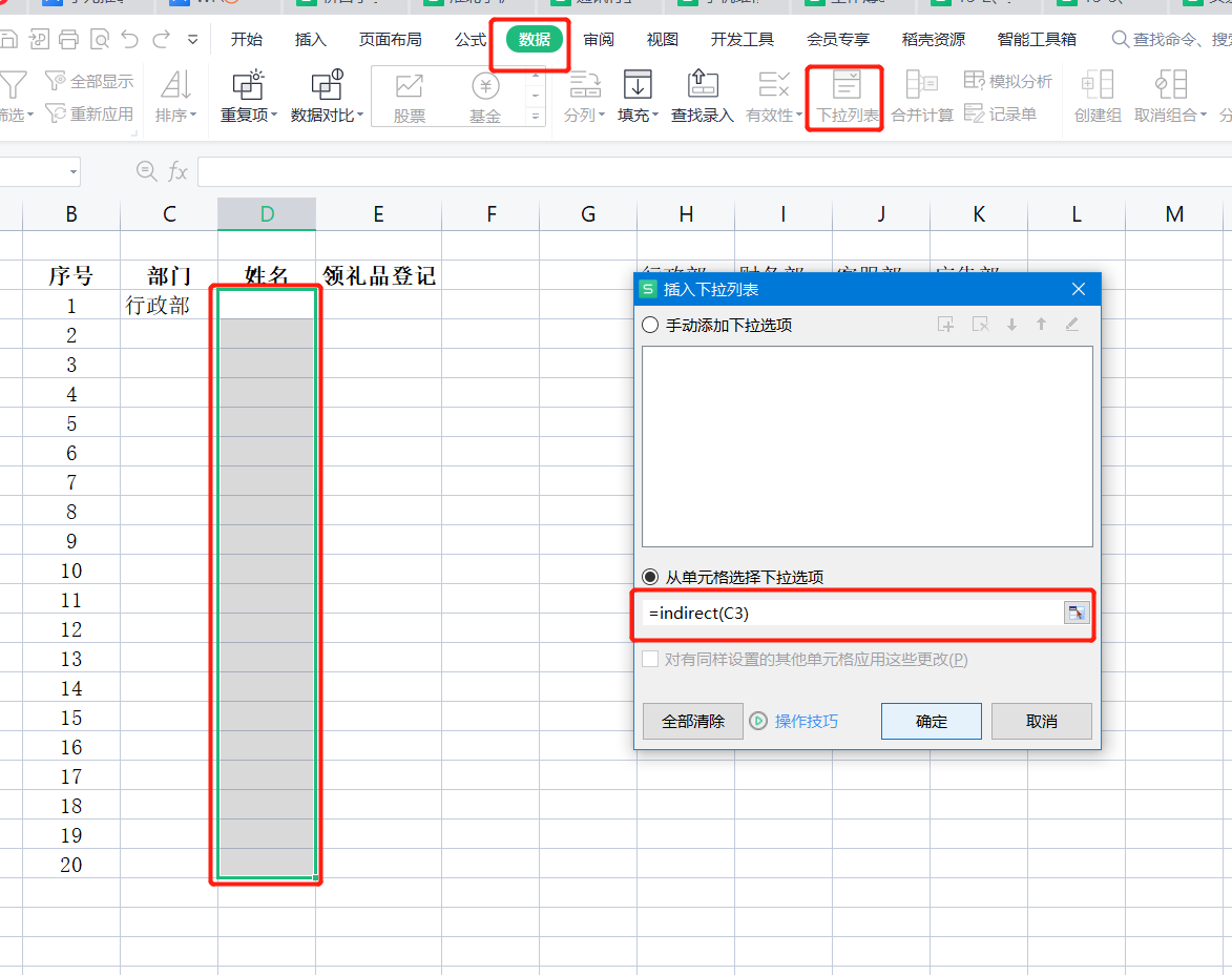 选中D2到D22单元格——点击数据——点击下拉列表——选中从单元格选择下拉选项——在里边输入=indirect(C3)这里边用相对引用即可,到时候也会学到这个函数,先照写。