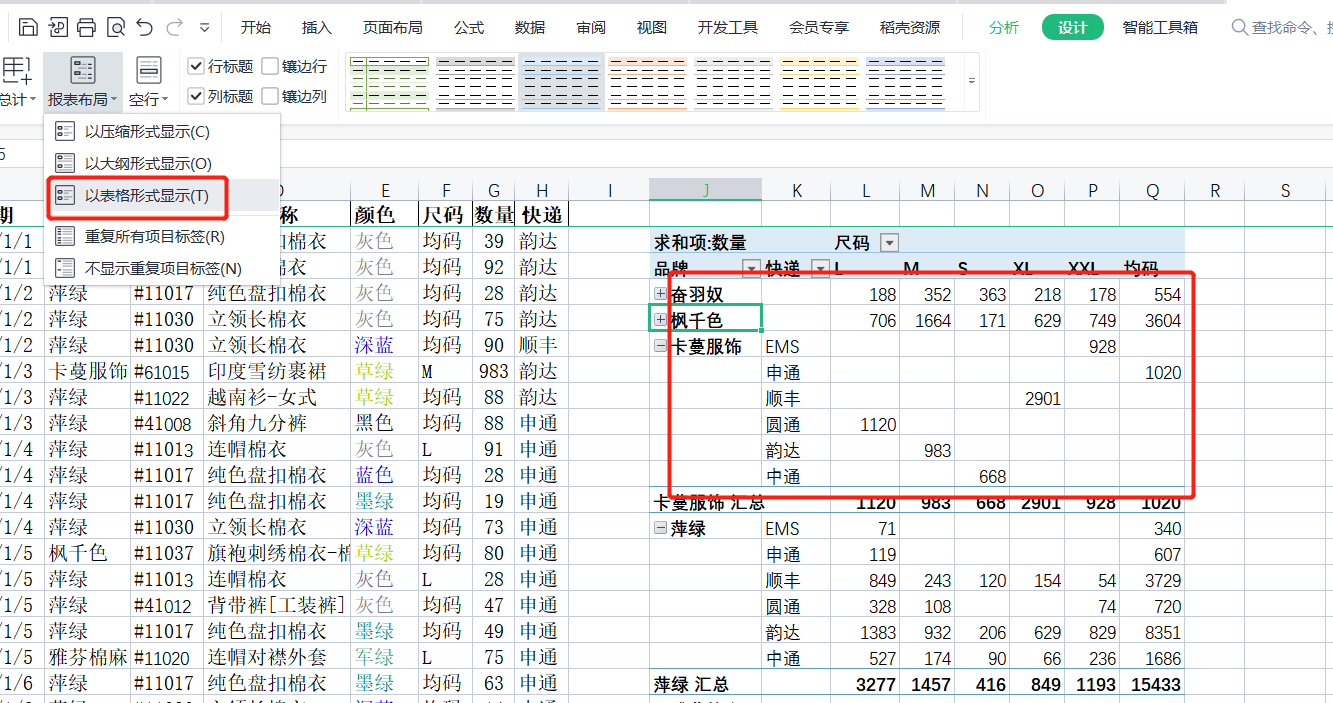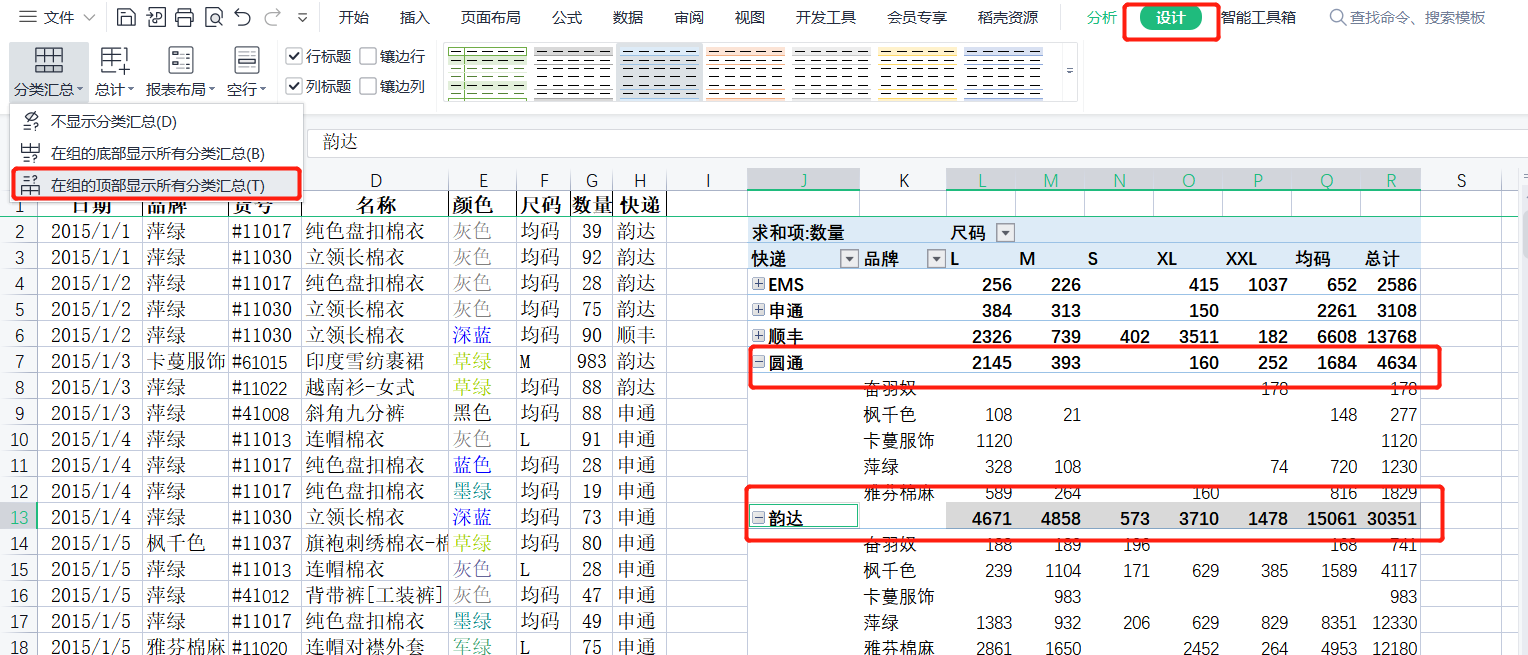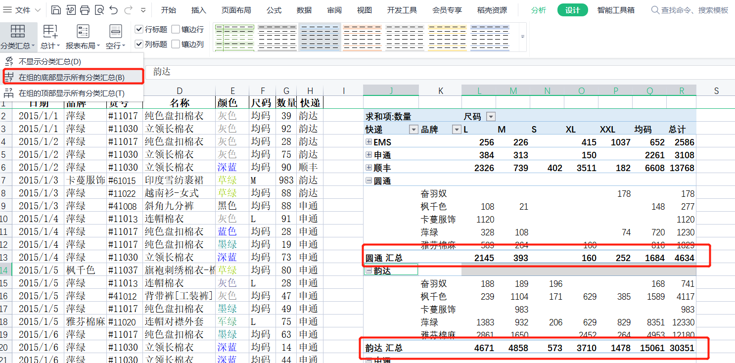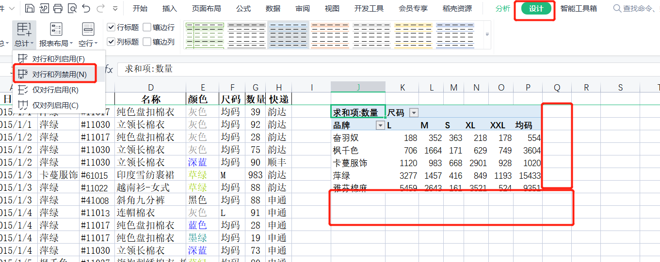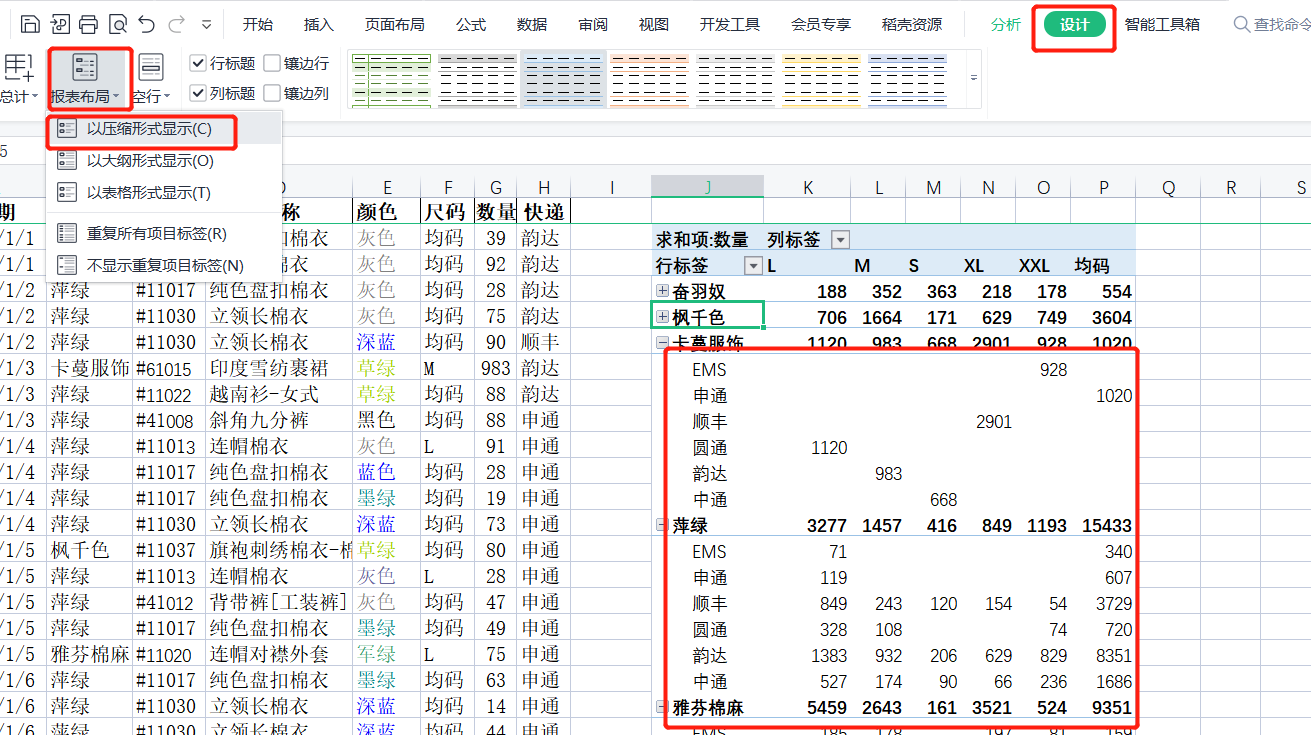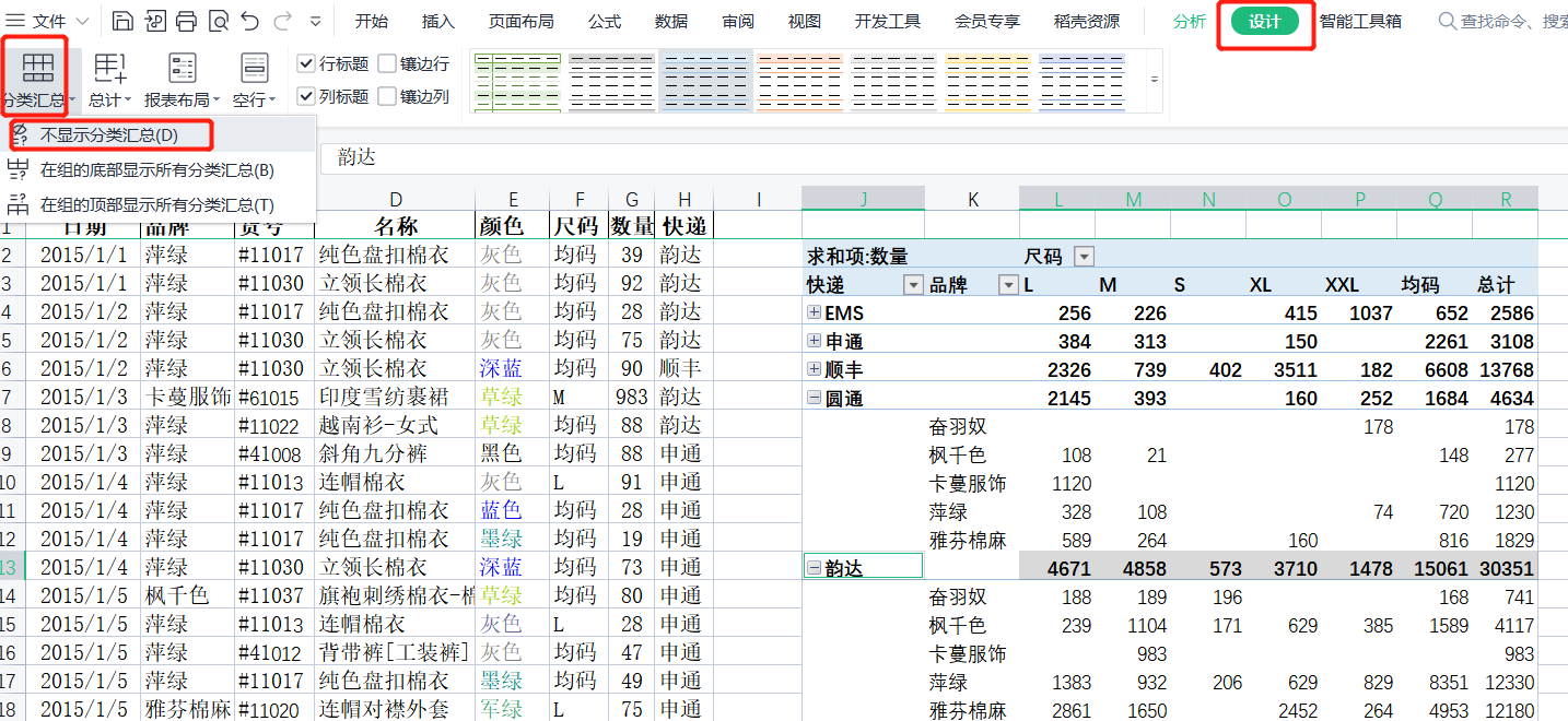 如果我们透视表行字段使用‘快递’一个区域,当我们点击设计——分类汇总三角下方的所有命令,都没有反应。只有当区域里有两个或两个以上的字段才有效果哦,这个一定要注意。