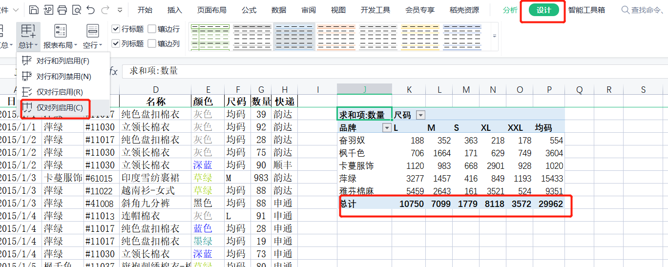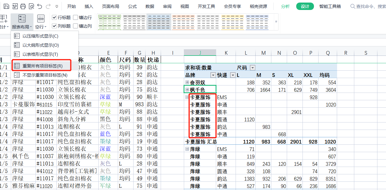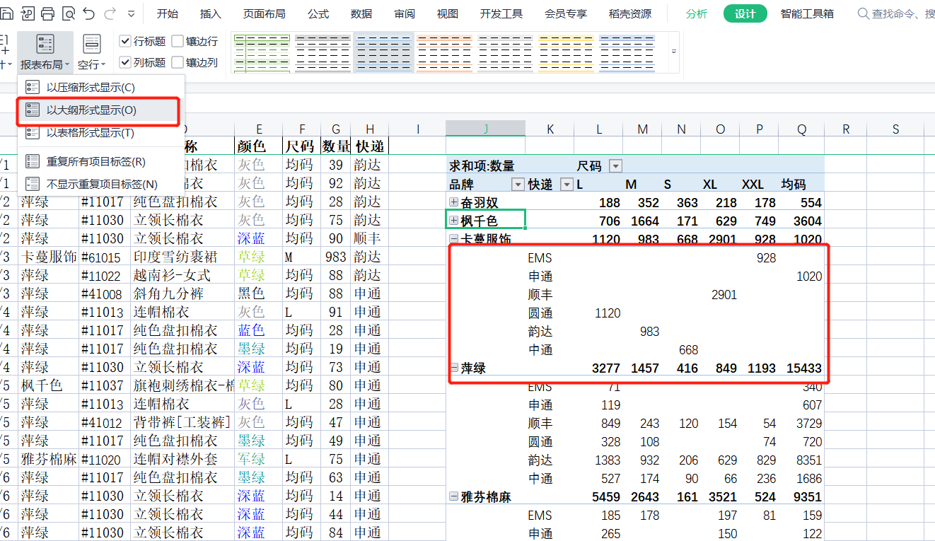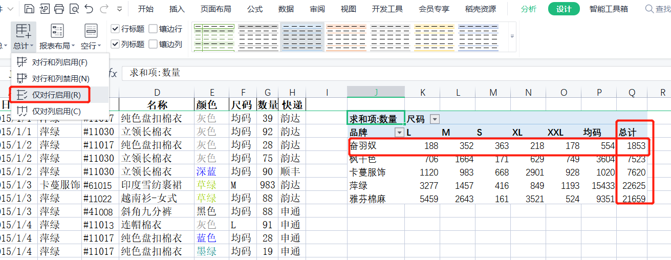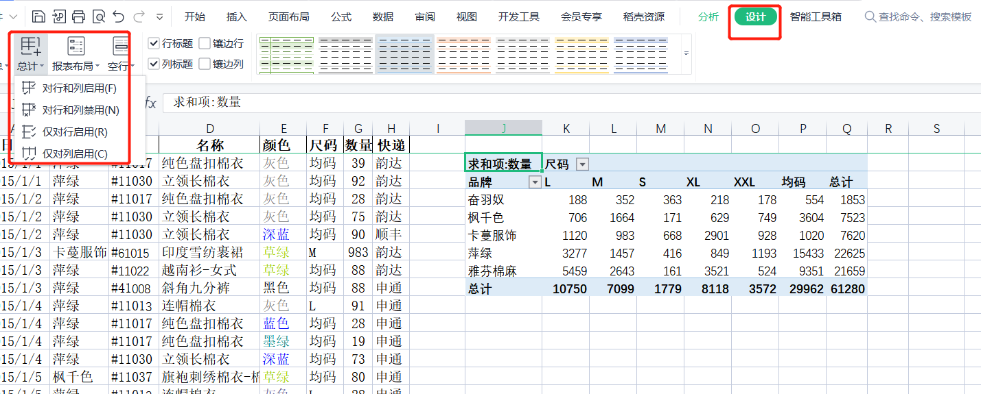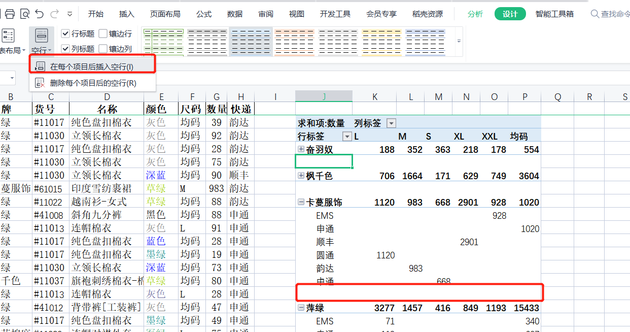 如果我们透视表行字段使用‘快递’一个区域,当我们点击设计——分类汇总三角下方的所有命令,都没有反应。只有当区域里有两个或两个以上的字段才有效果哦,这个一定要注意。