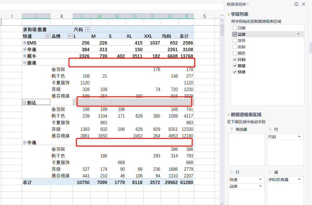 我们将行字段再叠加一个‘品牌’字段,这个时候我们再来操作试试看。