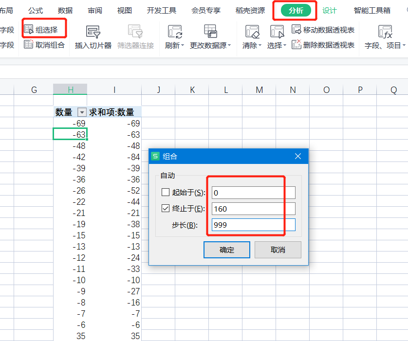 点击字段,分析—组选择,起始0,终止160,设置步长999,确定。(这样设置就是想把正数放一字段,负数放一字段,步长设置大一点没关系,尽量让步长>=终止数(最大数))。如果这一步看不懂的话,随时关注私聊我。