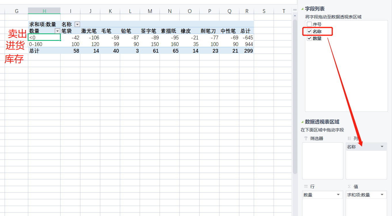 接下来我们把名称字段放在列字段,可以看到一个不一样的透视表,是不是一目了然。相当于进货多少,卖出多少,剩下库存多少。
