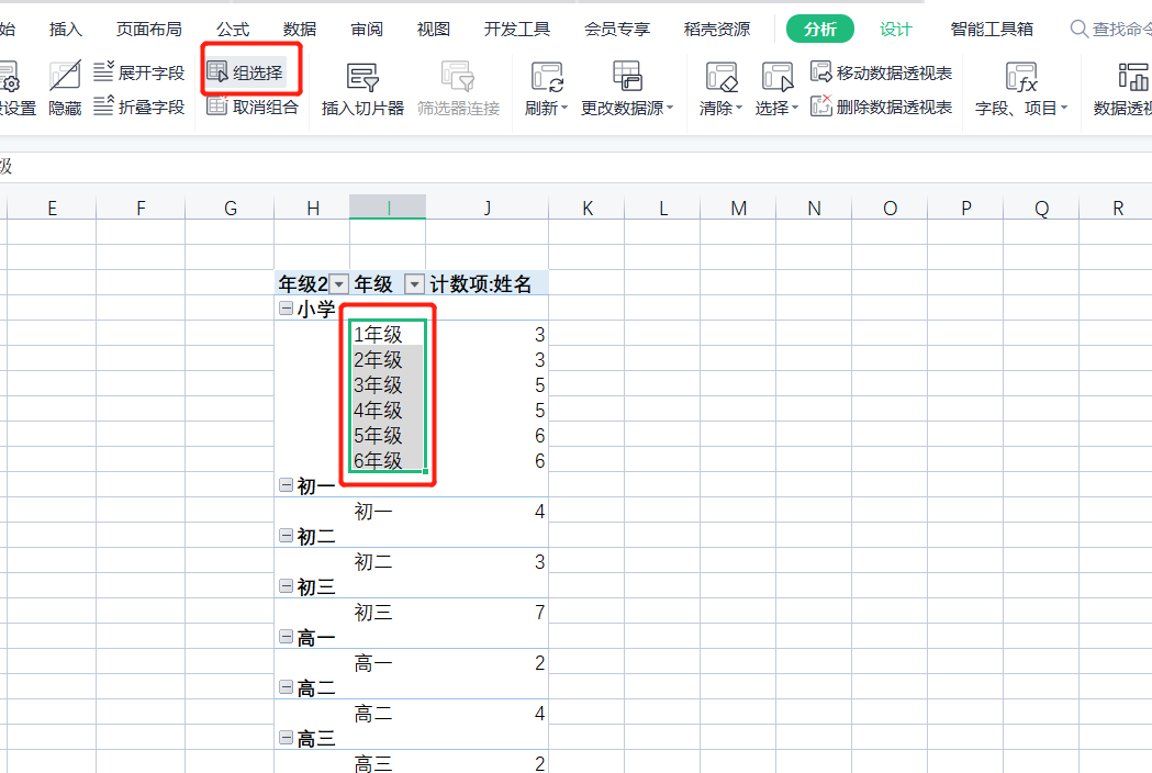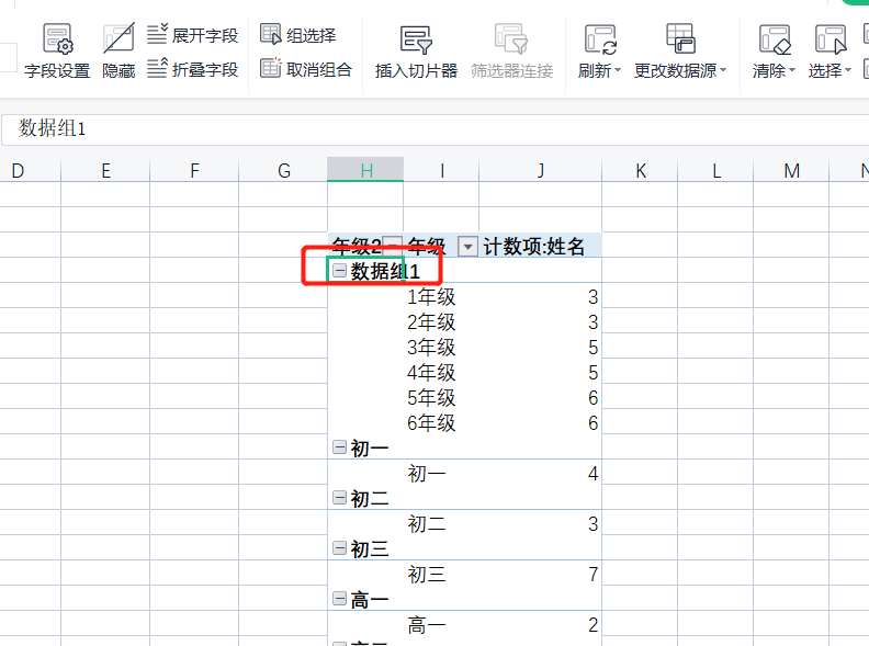 在数据组1,直接输入小学,我们发现前面有个-号(相当于展开字段,+号代表折叠字段),以下同理,自己操作一下哦,把初一到初三设置成初中,高一到高三设置成高中。