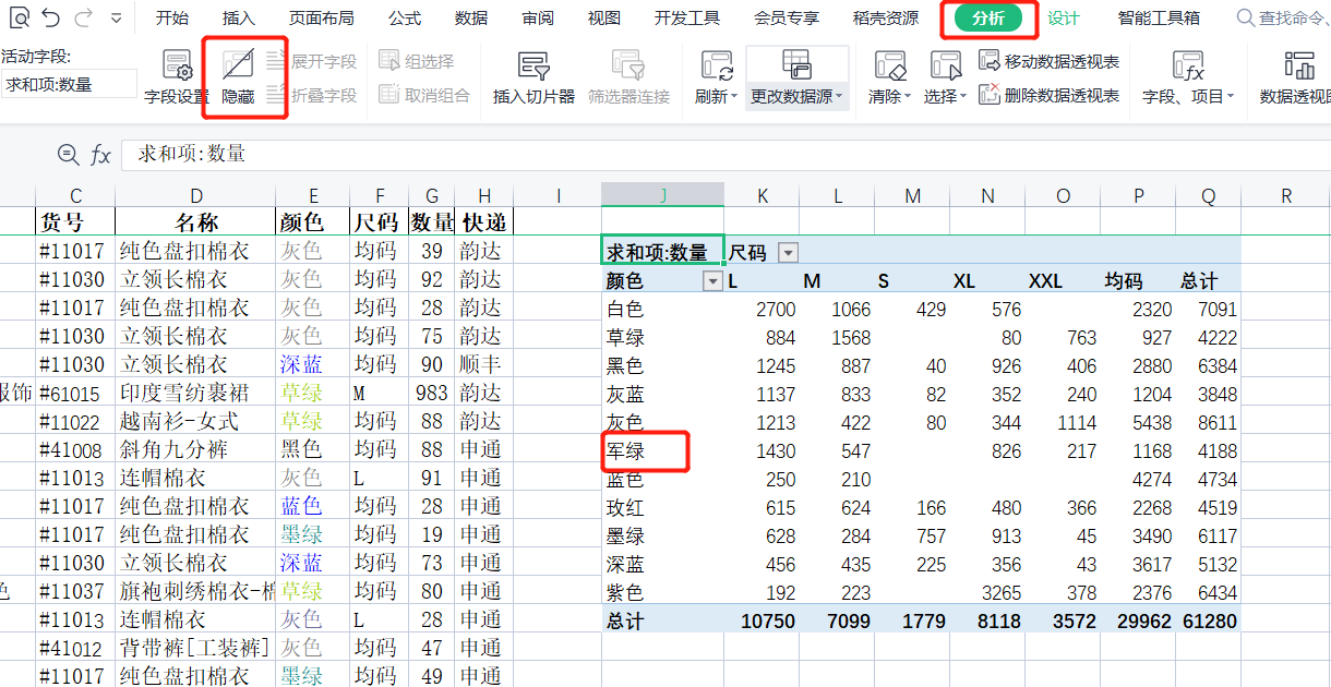 点击选定的字段。分析—隐藏(相当于进行了筛选)