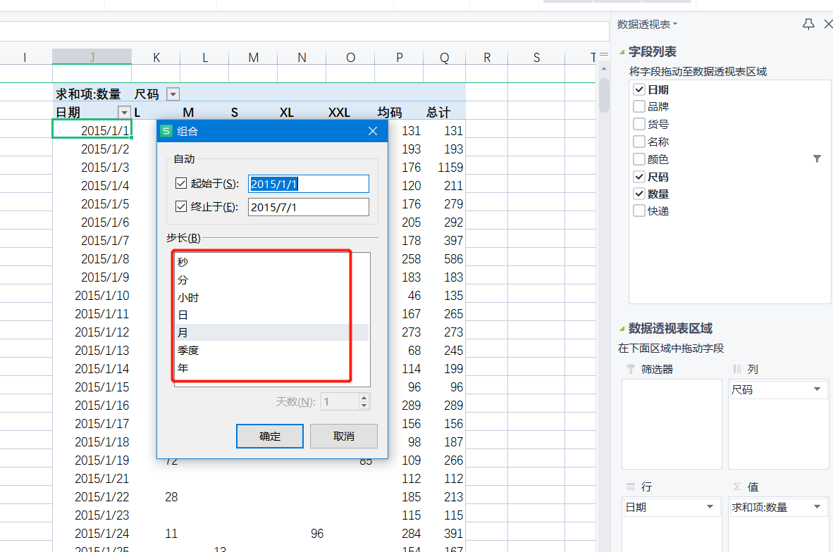 日期组合:点击字段,分析—组选择,设置日期的步长,确定