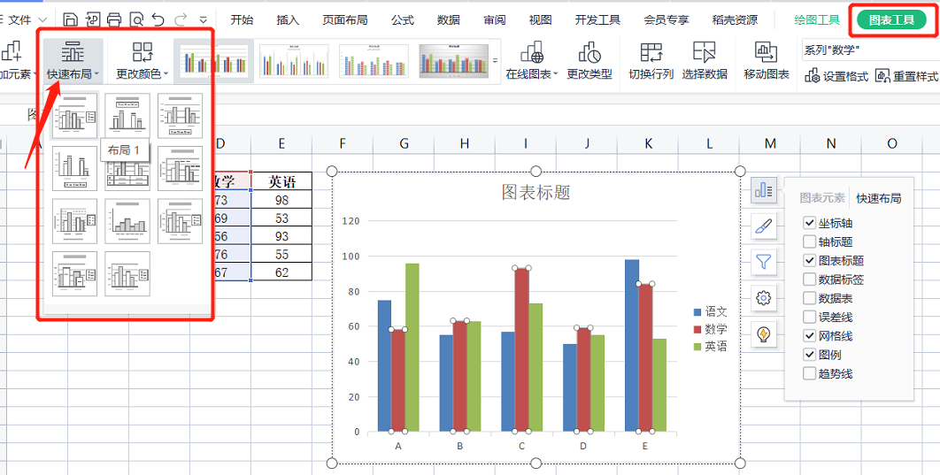 操作:图表工具——快速布局(或选中图表——图表右侧的“图表元素”按钮)