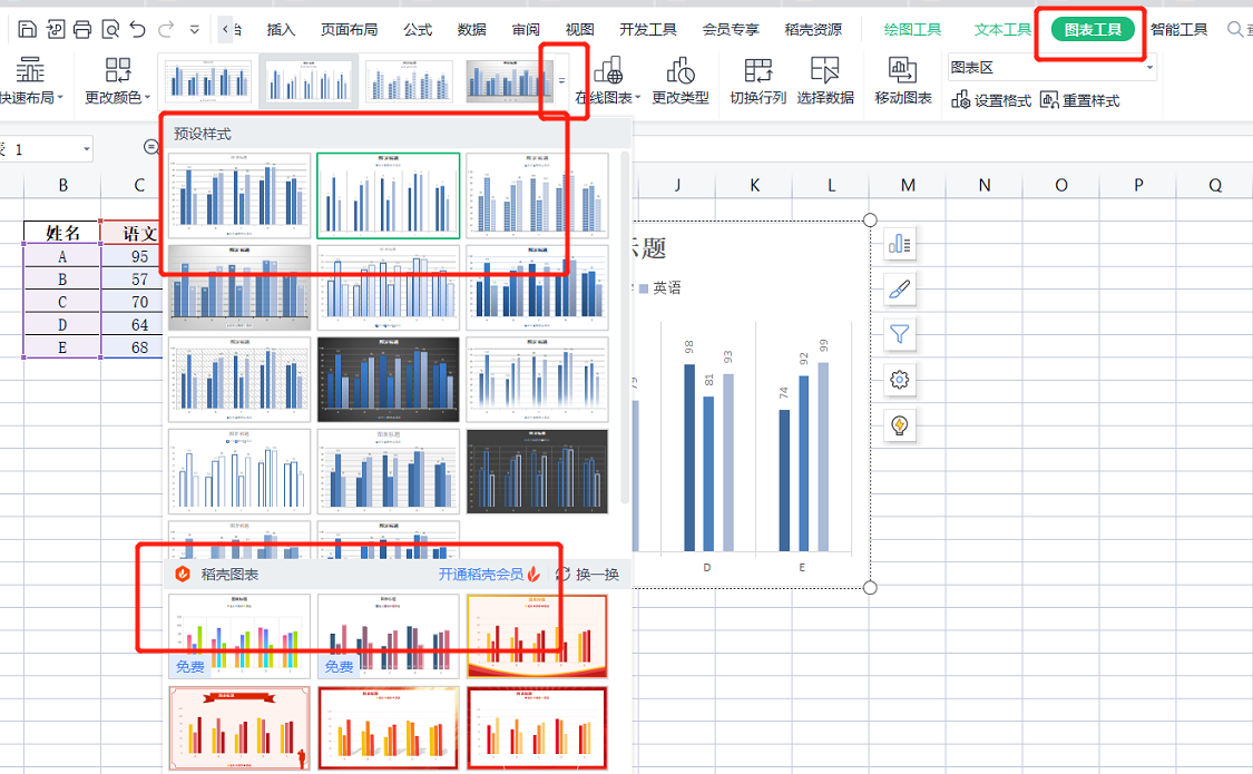 更改样式:一次更改图表的多方面设置(免费样式、付费样式)。