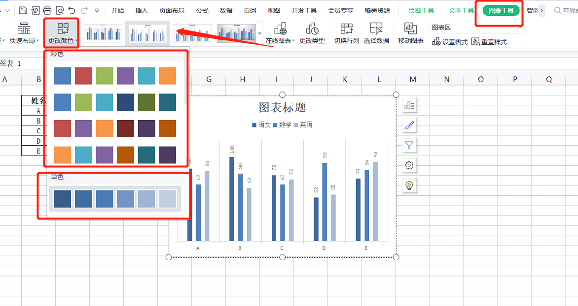 更改颜色:改变图表的配色方案(彩色、纯色)
