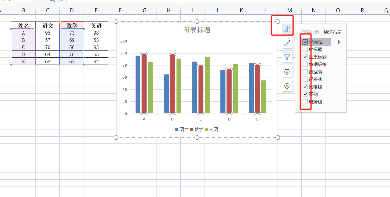 操作:选中图表——图表右侧的“图表元素”按钮,勾选就是添加,不勾选就是隐藏。