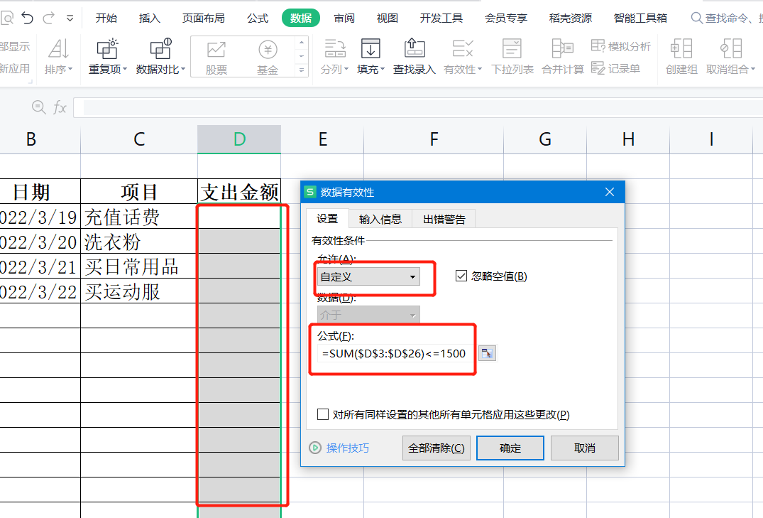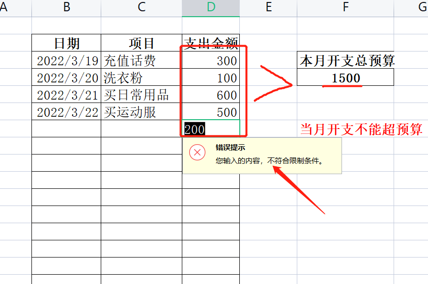 这个时候我们可以在‘支出金额’里输入数字试试看哦。当结果大于1500的时候,就会有提示了,如下图所示。