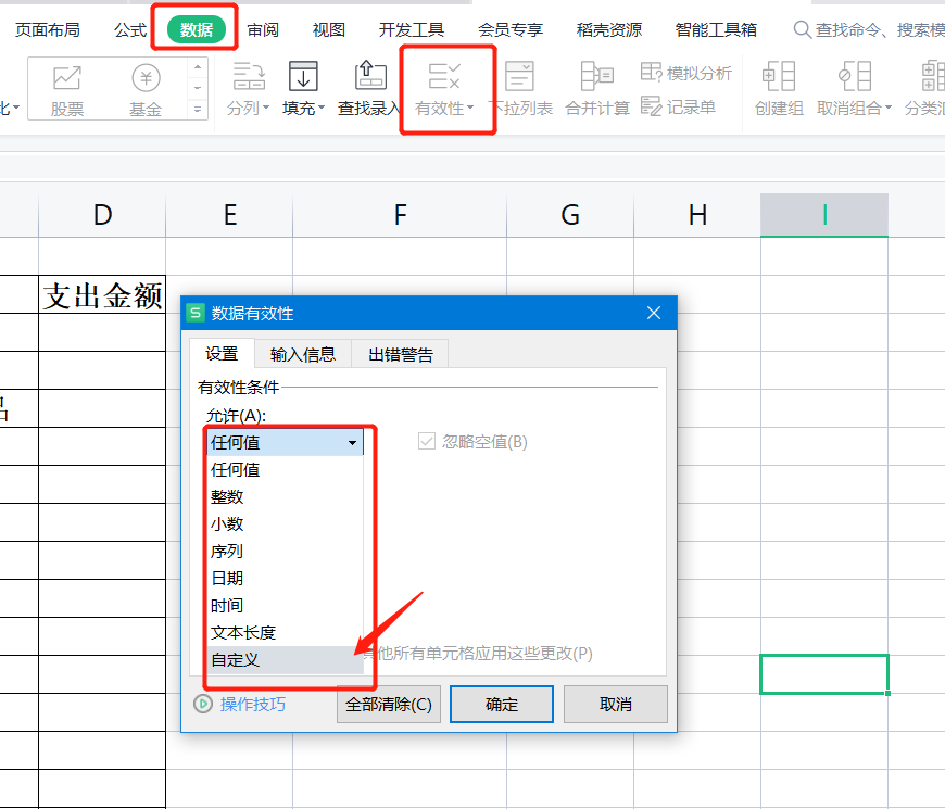 有些有效性的条件,用预设的选项可能达不到,这种情况就可以使用自定义有效性条件。
