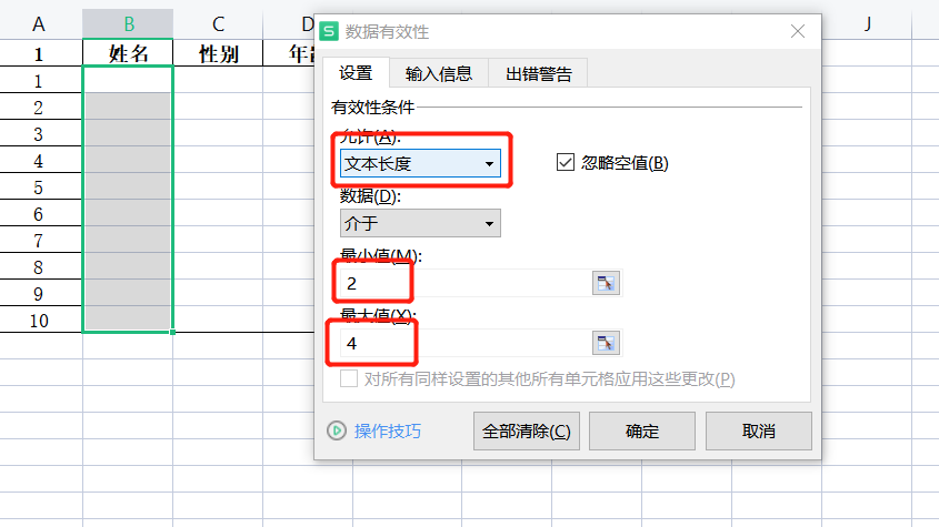 如下图所示,姓名一般都是2个字,最多 4个字。这个时候我们就可以使用文本的长度,在介于之间去选择。
