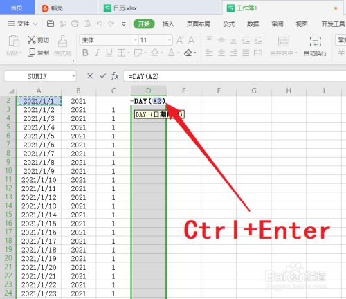 9.同理计算”日“列,输入公式:=DAY(A2),按”Ctrl+Enter“,填充所有已选的单元格;