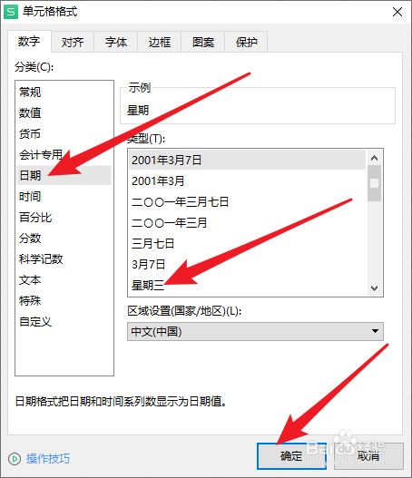 14.选择“日期”,格式选择“星期三”,点击确定;