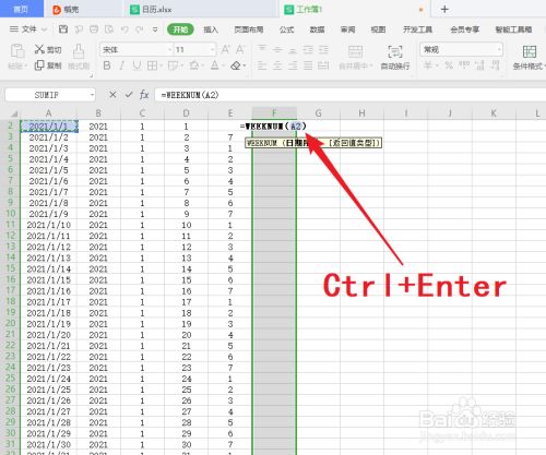 11.同理计算”周数“列,输入公式:=WEEKNUM(A2),按”Ctrl+Enter“,填充所有已选的单元格;