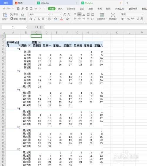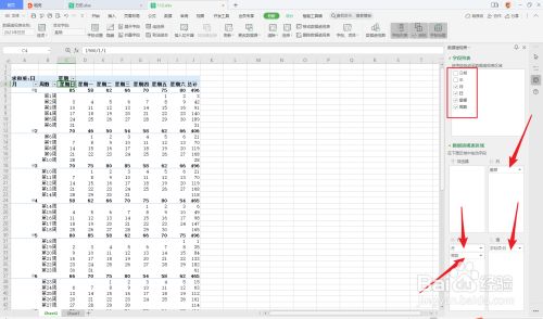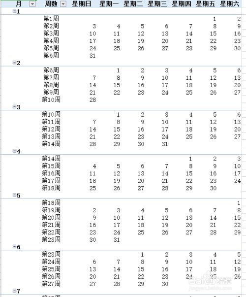 20.按照图示,依次将星期拖入列,将月和周数次序拖入行,将日拖入值;